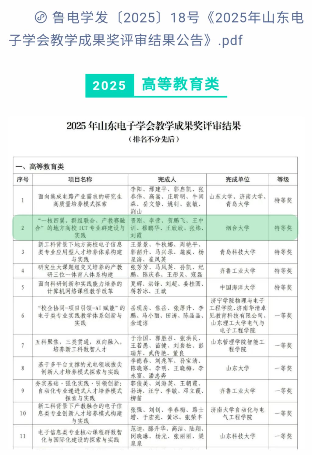 申报的“‘一核四翼、群组联合、产教赛融合’的地方高校ICT专业群建设与实践”获评2025年山东电子学会教学成果奖高等教育类特等奖。