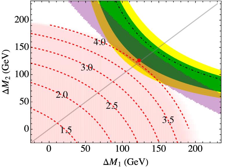 图:解释W-玻色子质量反常(黄色与绿色区域)、暗物质(紫色区域)、电弱相变(红色区域)的可行参数空间。