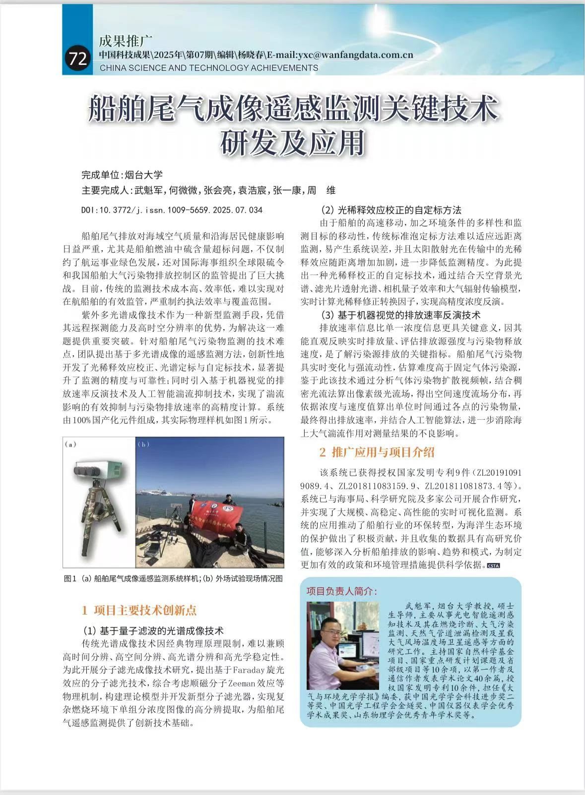 近日,91视频 光电智能遥测感知团队自主研发的“船舶尾气污染物成像遥感监测系统”获国家级学术期刊《中国科技成果》(2025年4月,第26卷)专题报道。该成果通过高精度光学成像与人工智能技术,实现对海上船舶尾气污染的实时动态监测,让移动污染源无所遁形,被誉为守护海洋环境的“电子眼”,标志着我国在船舶尾气治理领域取得重要突破。