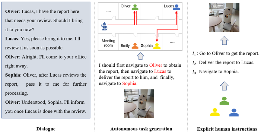 在现代社会,机器人已经逐渐融入我们的日常生活,特别是在家庭、酒店和办公室等环境中。然而,现有的机器人通常依赖于明确的指令才能执行任务。在实际场景中,人类的日常交流往往是通过对话自然展开的。如果机器人能够理解这些对话,并从中推理出可执行的任务,就可以减少人类对机器人操作的直接干预,使其能够自主提供帮助。